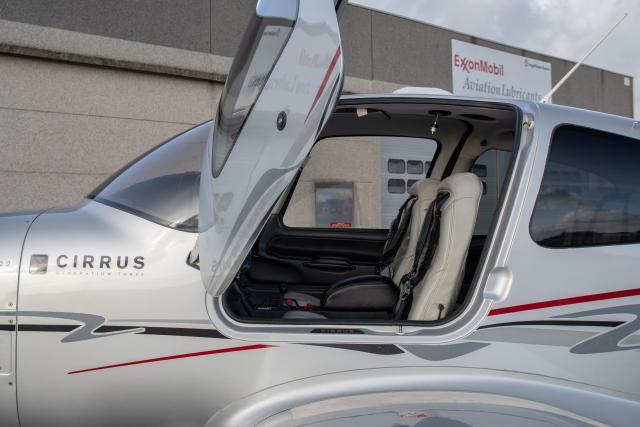 The exterior of this Cirrus SR22G3 Turbo Normalized remains as striking as the day it left the factory, featuring the timeless Sterling silver base design. The sleek fuselage is accented by a dynamic multi-tone stripe package in Grey, Black, Red, and Blue, creating a ramp presence that perfectly complements its high-performance capabilities.